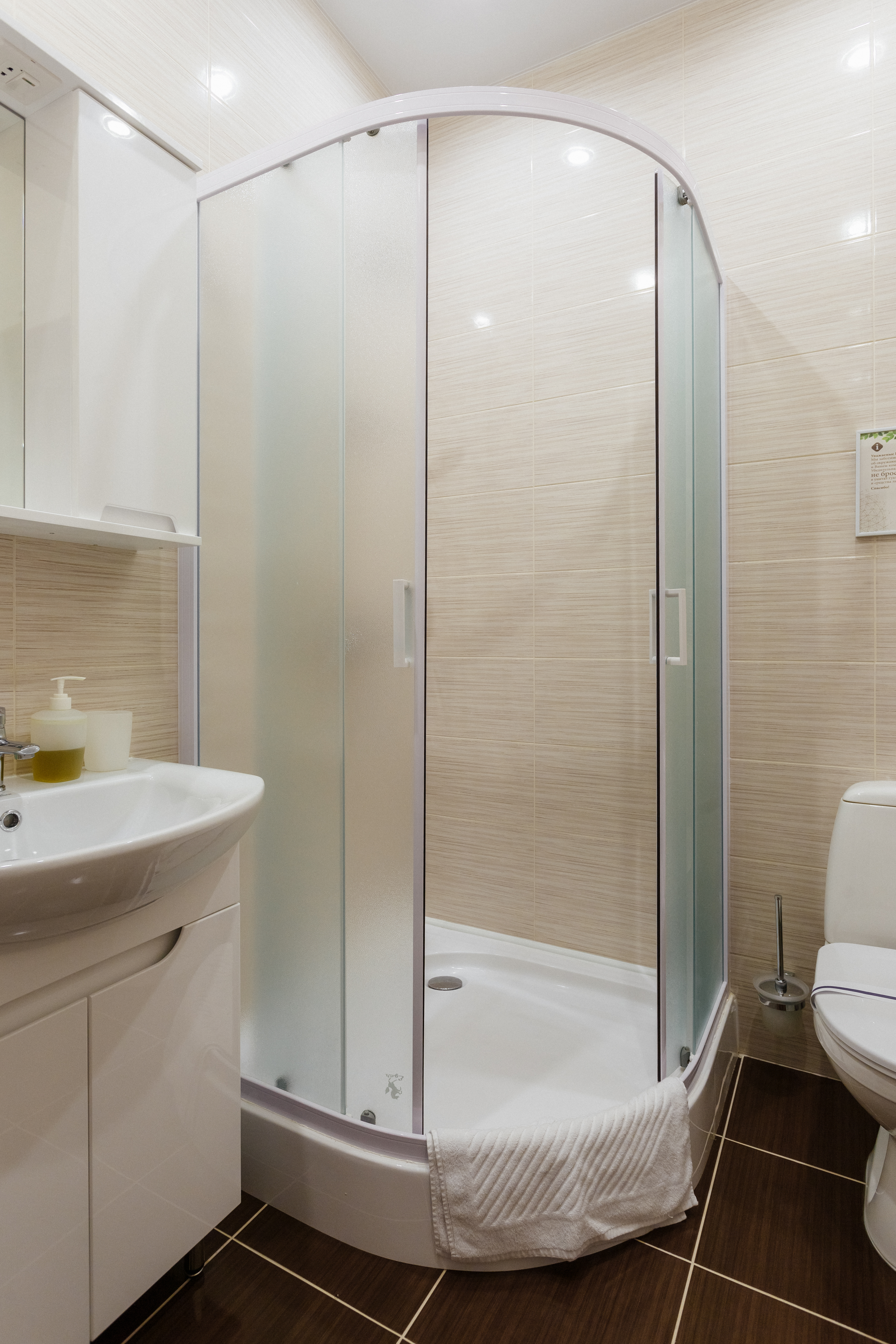 Просторная душевая кабина Туалетные принадлежности Тапочки Немецкая сантехника Зеркало, фен |