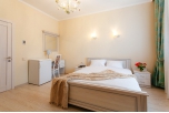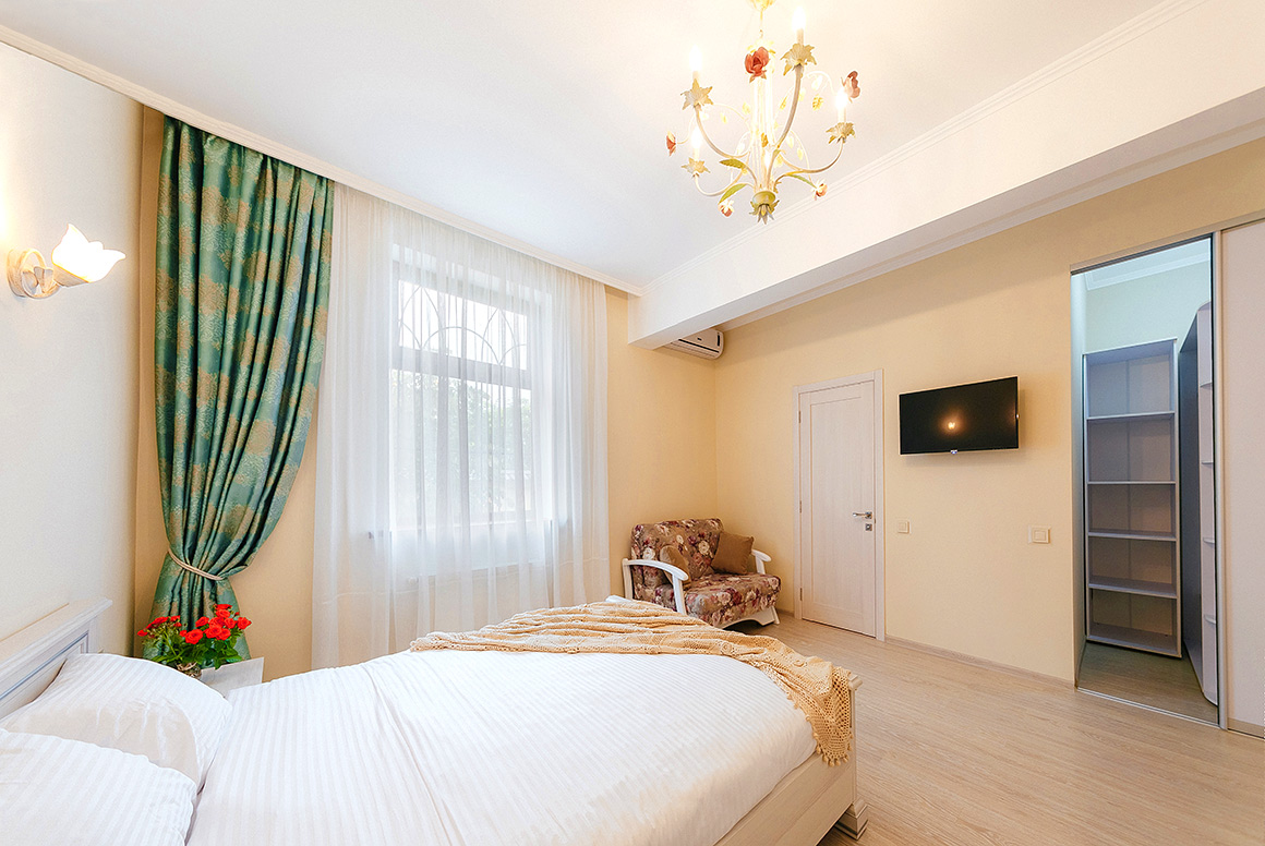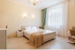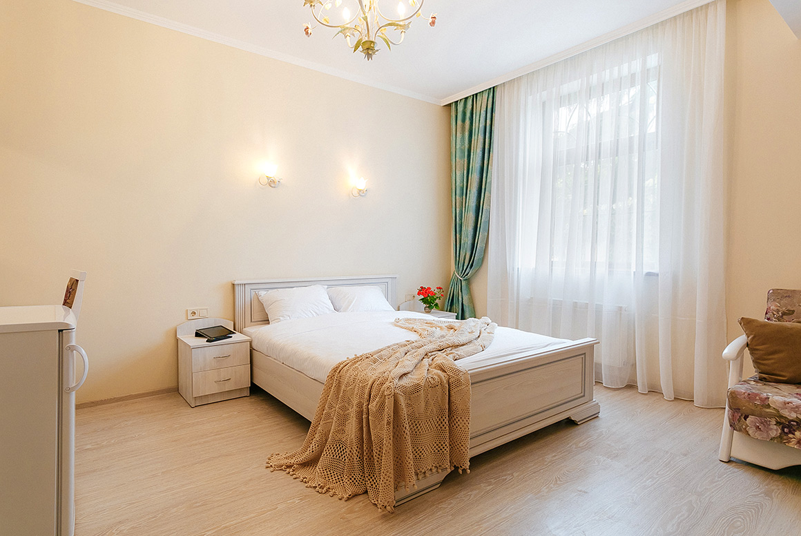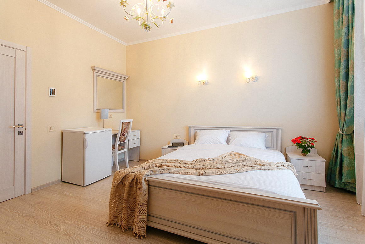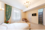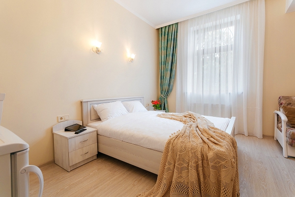 Однокомнатный номер на 1-ом этаже,площадью 18 кв.м,с двуспальной кроватью. Покрытие пола - ламинат. В номере имеется гардеробная. Санузел с большой угловой ванной и биде. В номере есть кресло, которое при необходимости можно разложить в удобное спальное место.