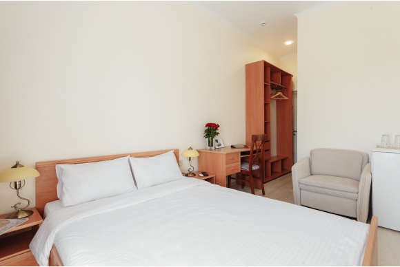 Кровать с ортопедическим матрасом Гипоаллергенные подушки и одеяла Письменный стол Кресло Кондиционер Холодильник |