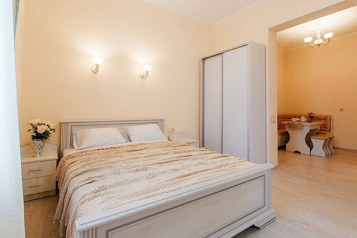 Однокомнатный номер на 1-ом этаже,площадью 22 кв.м с двуспальной кроватью и небольшой обеденной зоной. Покрытие пола - ламинат. Санузел с большой угловой ванной.