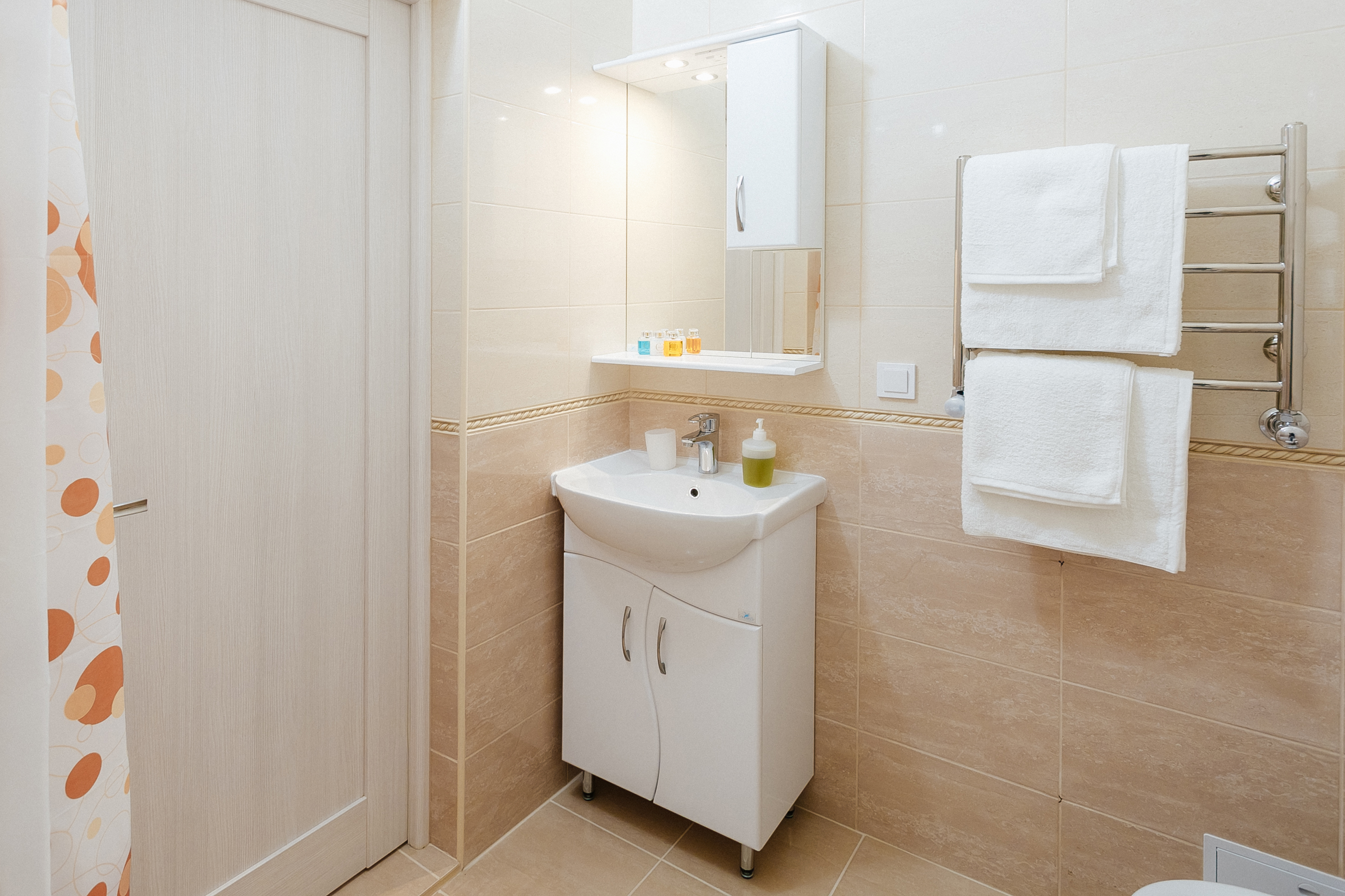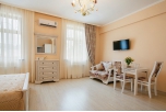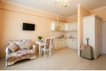 Однокімнатний сімейний номер на 1-му поверсі готелю площею 30 кв. Спальна зона з великою двоспальною. Зона кухні з вбудованими кухонними меблями, електроплитою, мийкою та потужною витяжкою. У номері є крісло, яке розкладається у зручне спальне місце. Покриття підлоги номера – ламінат. Санвузол з великою ванною та біде.
