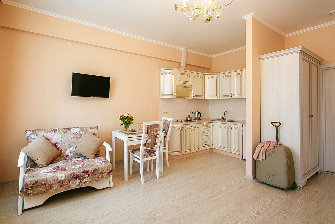 Кухня Ліжко з ортопедичним матрацом Комод із дзеркалом Обідній стіл та стільці Гіпоалергенні подушки та ковдри Кондиціонер Холодильник |