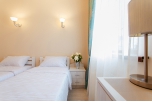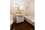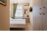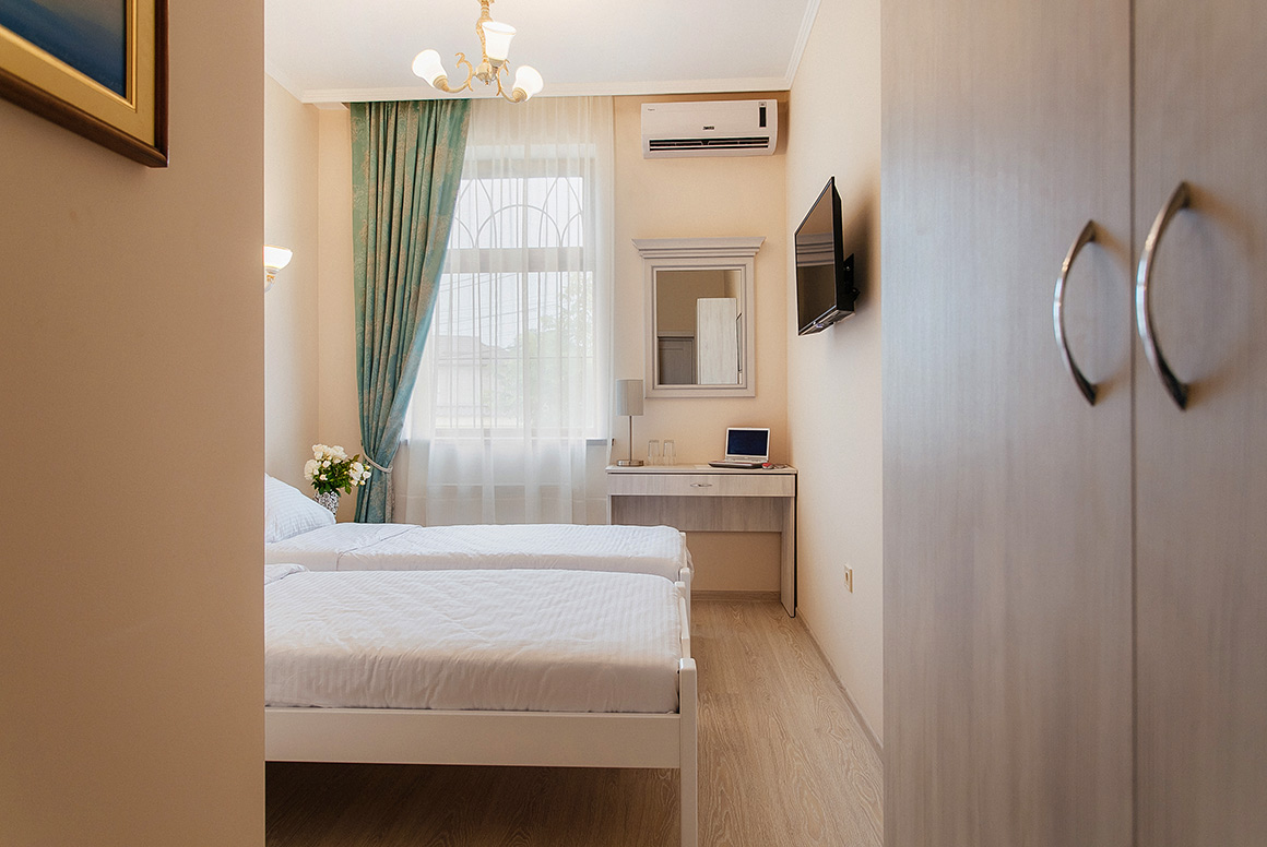 Однокомнатный номер на 1-ом этаже с двумя раздельными,односпальными кроватями,по желанию можно соеденить в одну двуспальную кровать. Покрытие пола - светлый ламинат. В санузле расположена небольшая ванна.