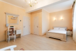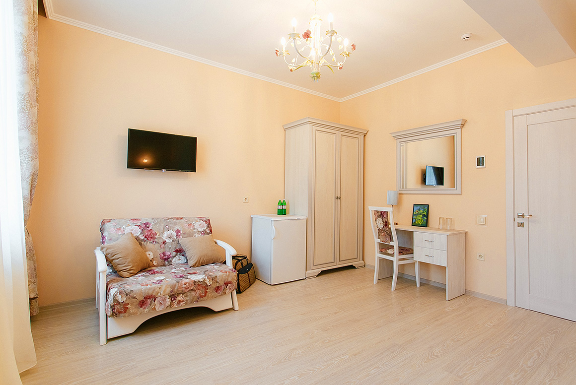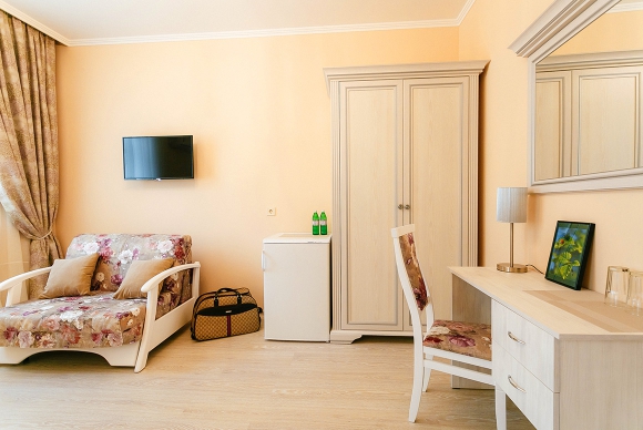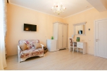 Однокомнатный номер на 1-ом этаже,площадью 20 кв.м с двуспальной кроватью. Покрытие пола - ламинат. Санузел с большой ванной и биде. В номере есть кресло, которое при необходимости можно разложить в удобное спальное место.
