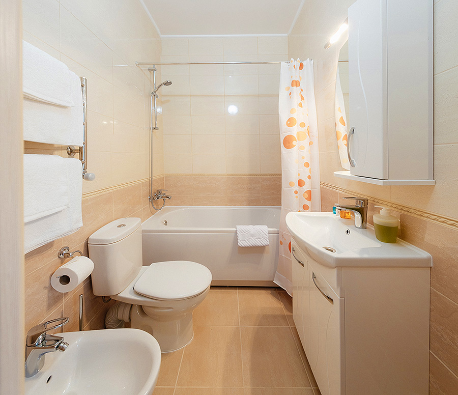 Большая ванна,биде Туалетные принадлежности Тапочки Немецкая сантехника Зеркало, фен |